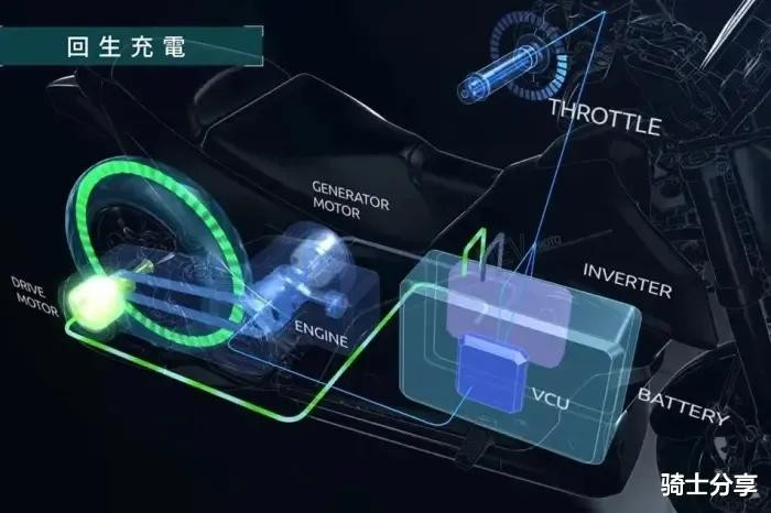 这套系统充分融合后,就能兼容电动机的瞬间爆发力和内燃机的动力延展性,并在内燃机工作的同时还可以给电池组充电。换言之摩托车起步时,先由电机驱动来完成初段加速,当达到一定极限时内燃机就可以接力完成下一轮驱动,而当动力不足时还可以双管齐下增强马力。
